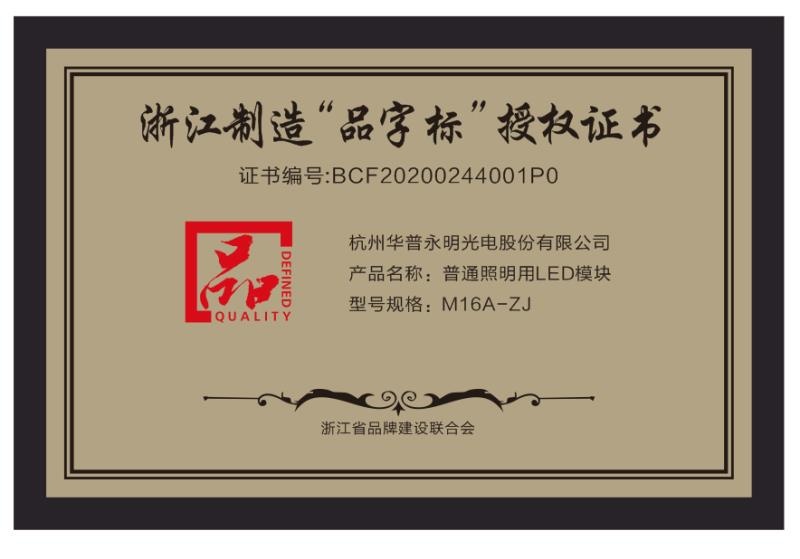 Zhejiang Manufacturing "Brand Mark" Authorization Certificate